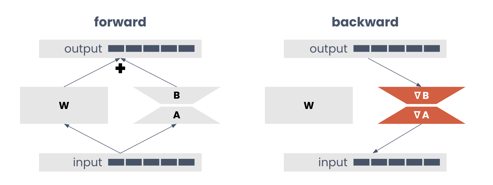 Architecture: LoRA inserts two matrices (A and B) into each target linear layer
